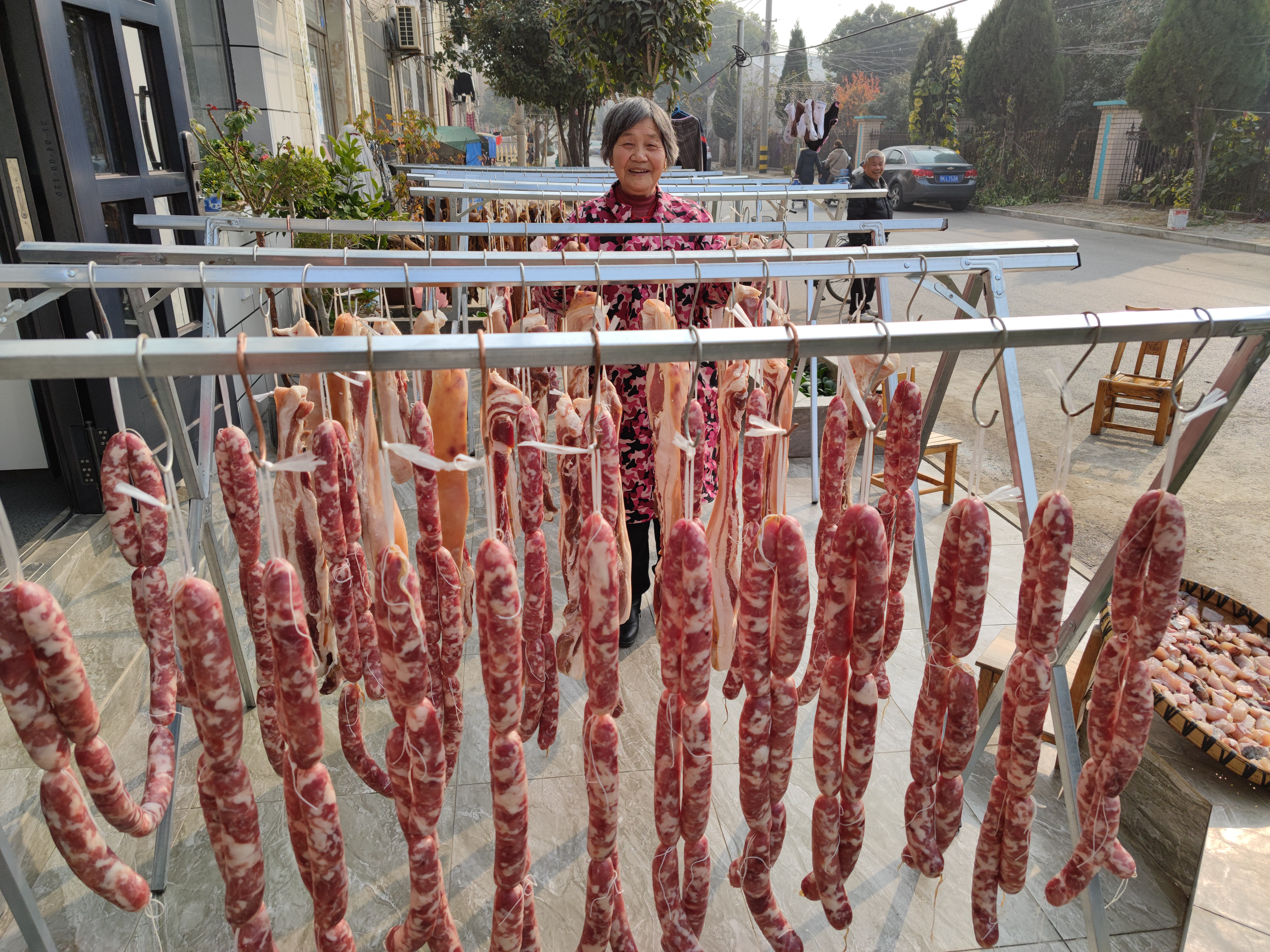这家主人介绍说,这晾晒的腊肉有300多斤,腊香肠有200多斤,还有腊鱼。去年的腊香肠更多,仅香肠就有300多斤。这些腊货孩子们喜欢,等晾晒好了就寄往北京等地,给儿女们品尝家乡的传统美食美味。