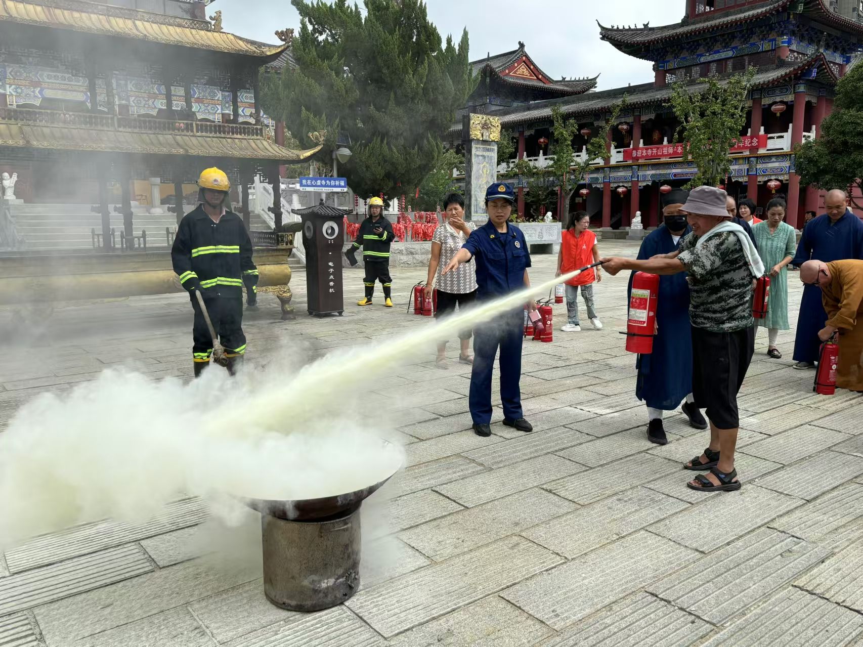 活动中,消防人员向宗教场所的工作人员和信徒讲解了初期火灾的正确扑救方法,并演示了灭火器、消防水枪及水带的使用技巧。现场人员还在消防人员的指导下,分组操作消防水枪,对模拟火点进行扑灭,确保每位参与者都能在实际情况中熟练使用消防设备。